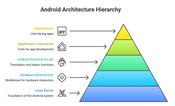 Think of Android like a multi-story building. Each floor has a specific job, and they all work together to make your phone function. The bottom floors (foundation) handle the heavy technical work, while the top floors are what you actually see and touch.