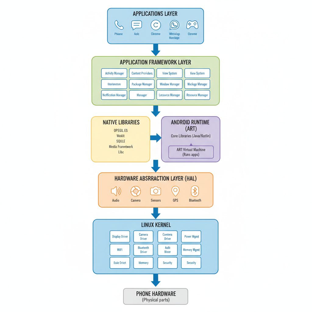 Think of Android like a multi-story building. Each floor has a specific job, and they all work together to make your phone function. The bottom floors (foundation) handle the heavy technical work, while the top floors are what you actually see and touch.